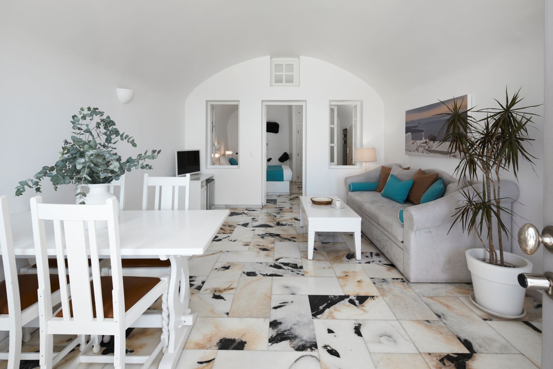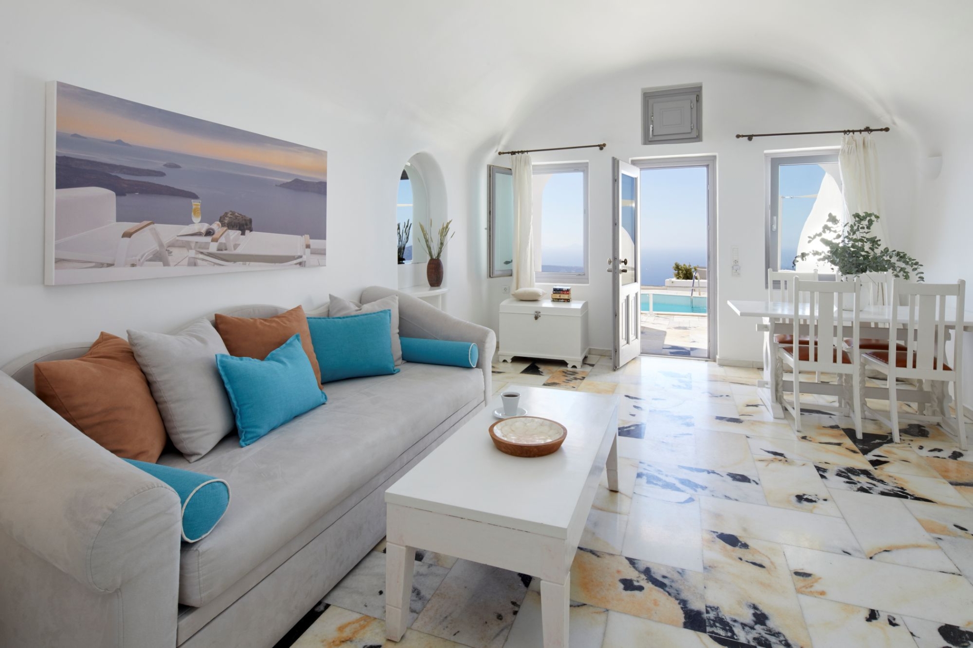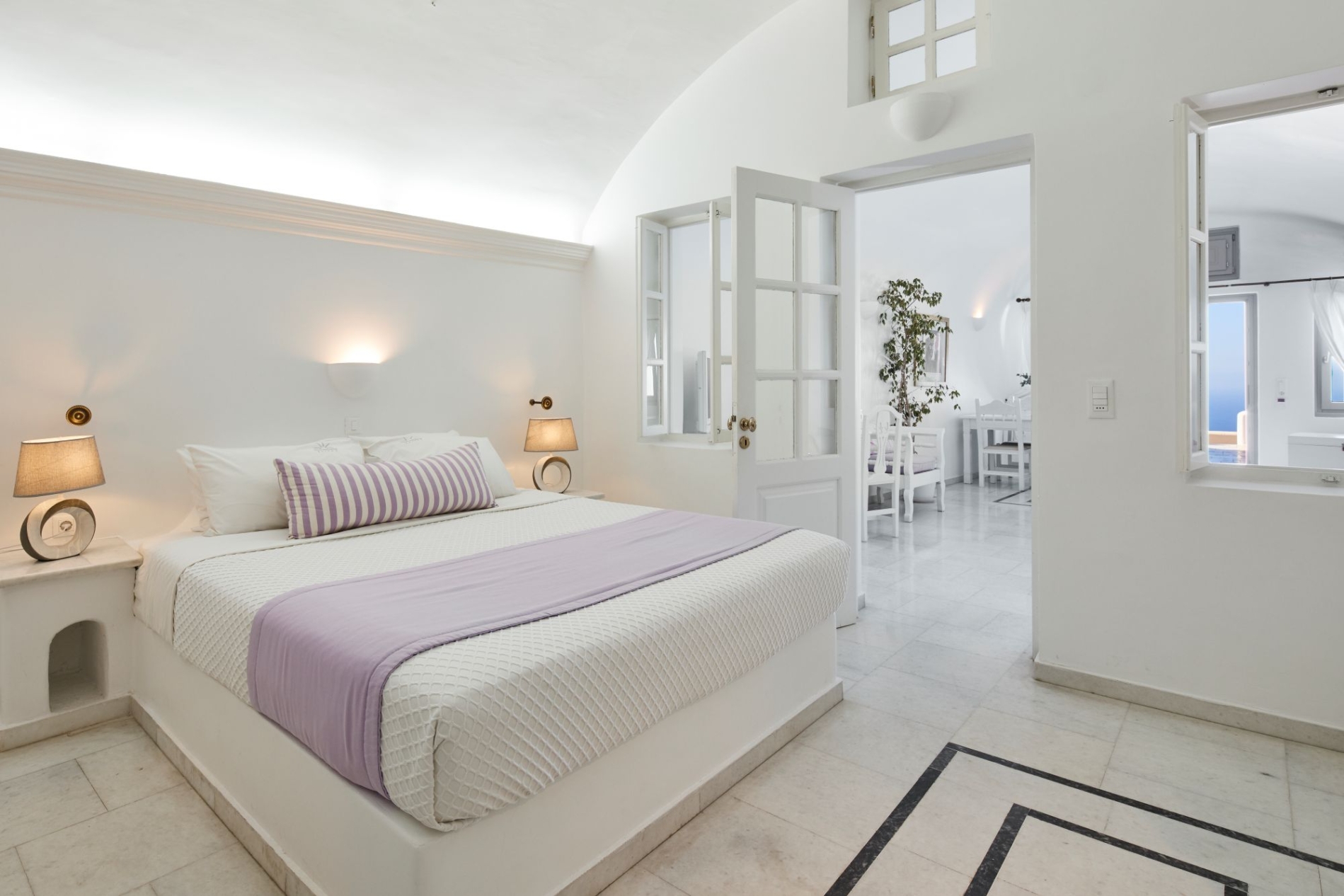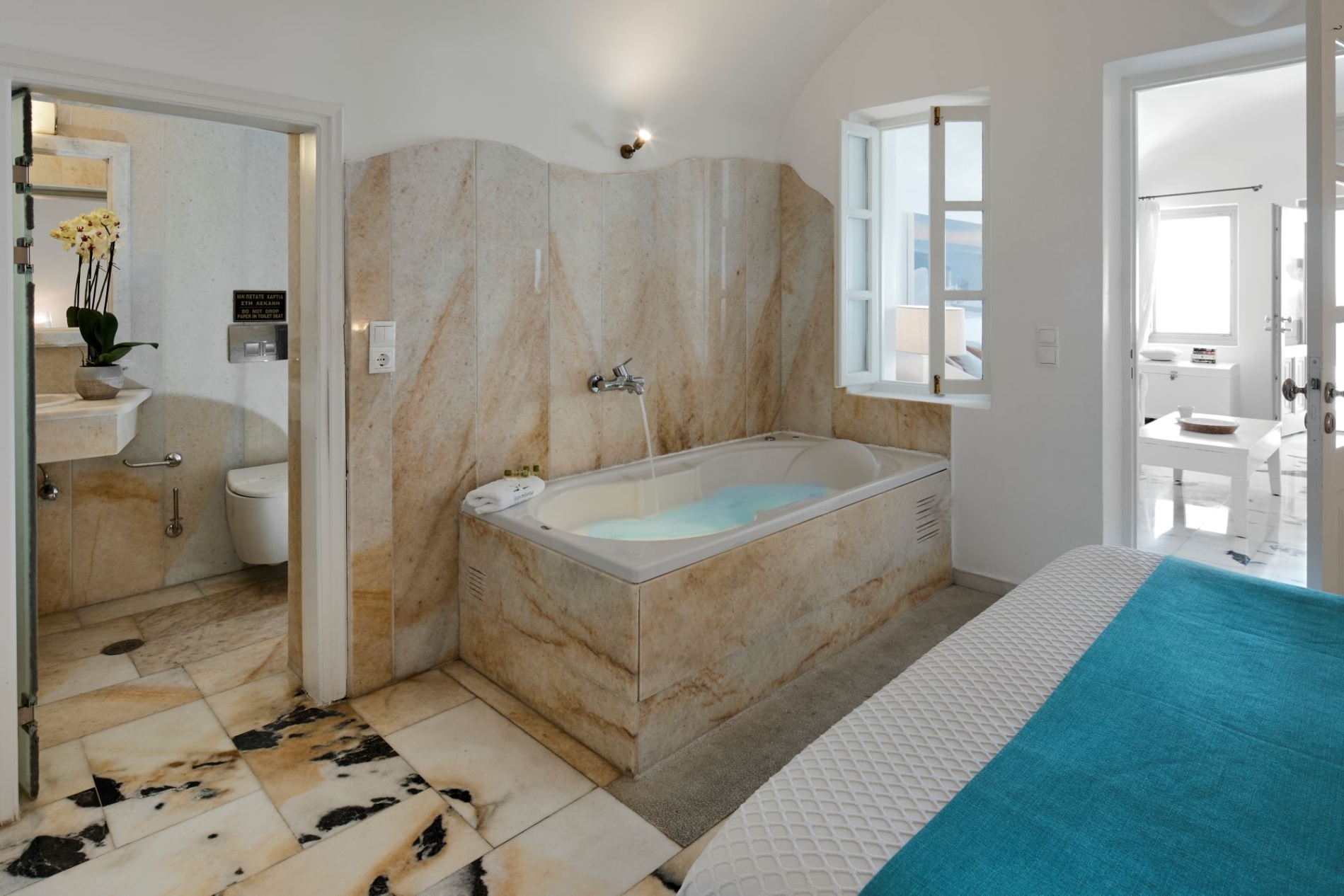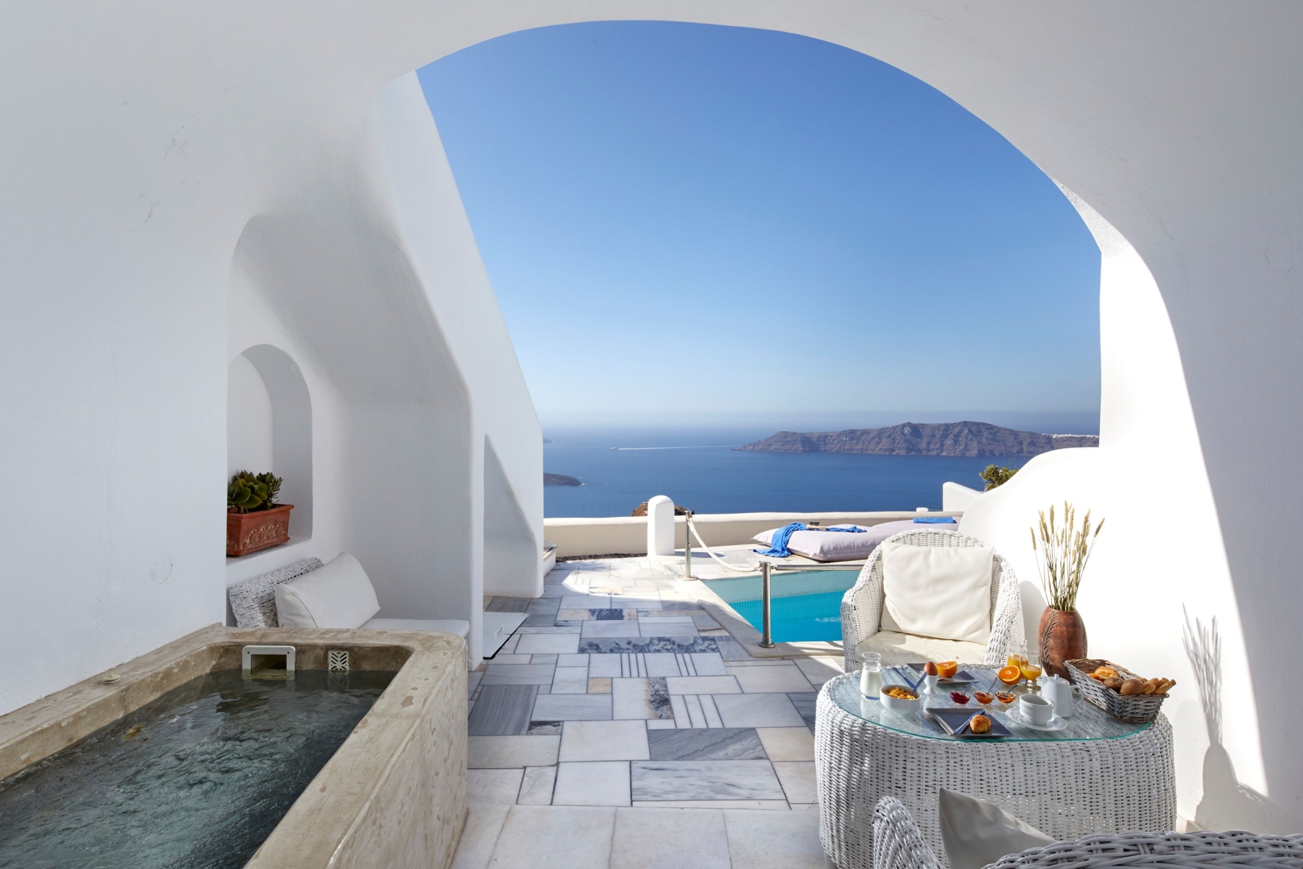 Ideally positioned for luxury getaways in the exceptional island of Santorini, Iliovasilema hotel in Imerovigli boasts the most romantic accommodation in this Honeymoon Suite With Jacuzzi & Caldera View occupying approximately 70m2 of Cycladic elegance. This chic romantic suite comprises of one spacious bedroom, a large living room area, one beautiful bathroom with shower and a veranda with outdoor Jacuzzi with the view of the Caldera.